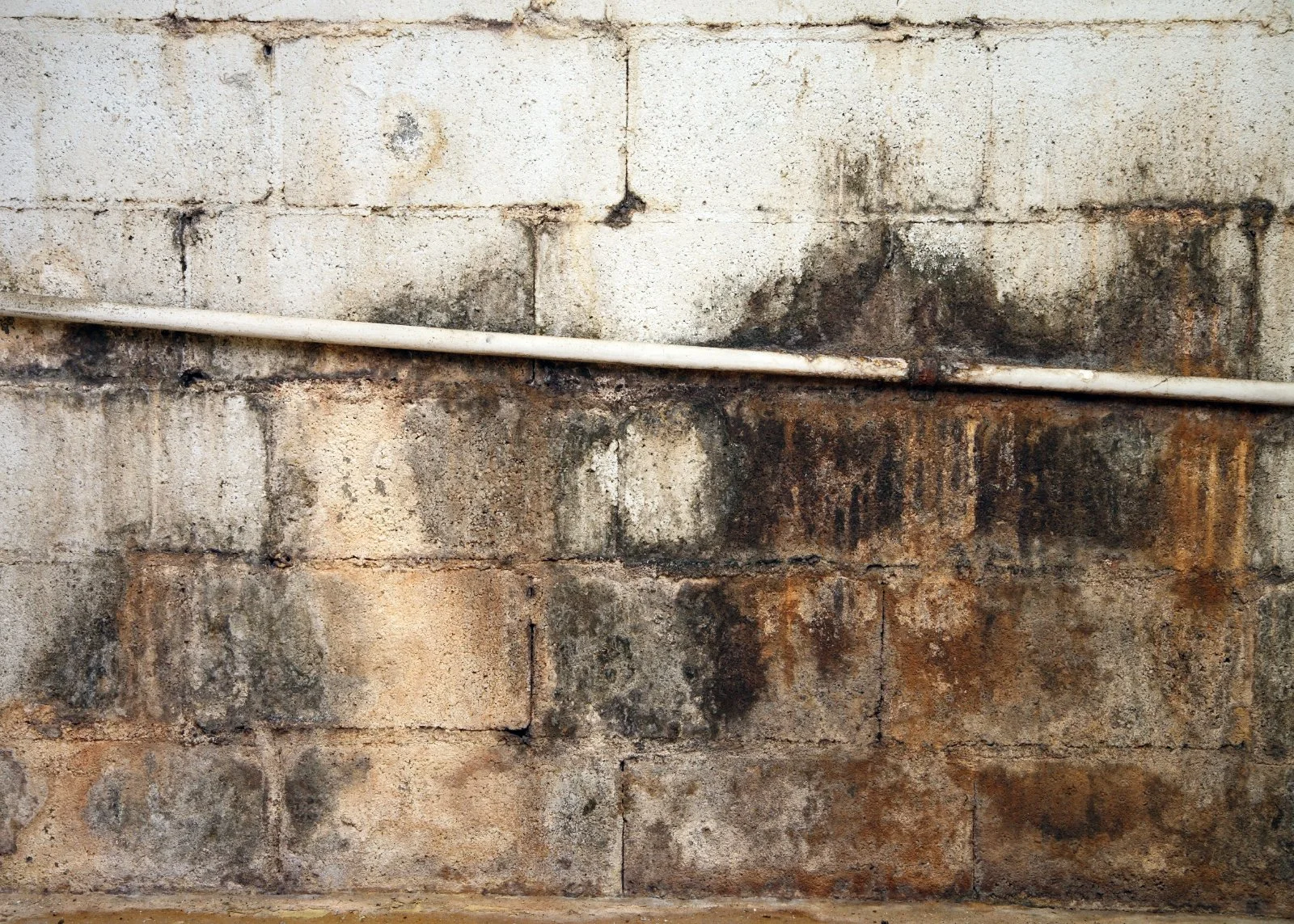 Mildew and black mold on a painted cinderblock wall in a home’s foundation.