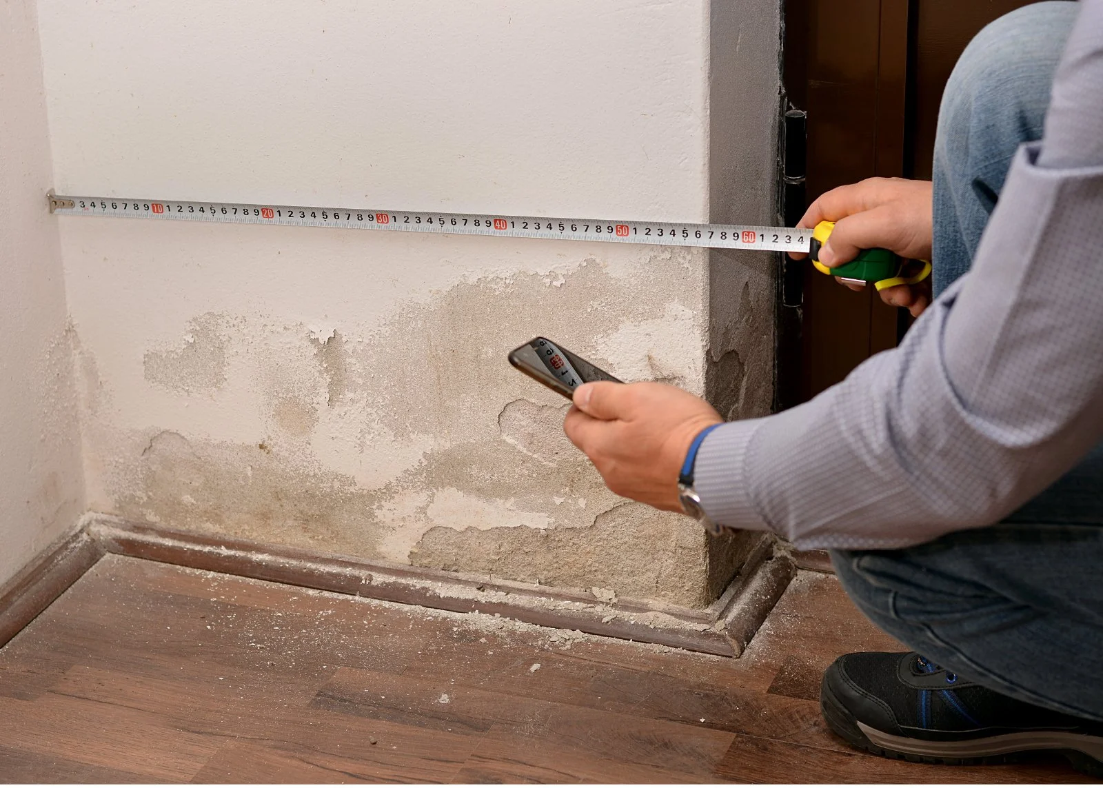 A man from the insurance company measures the extent of water damage on a basement wall.