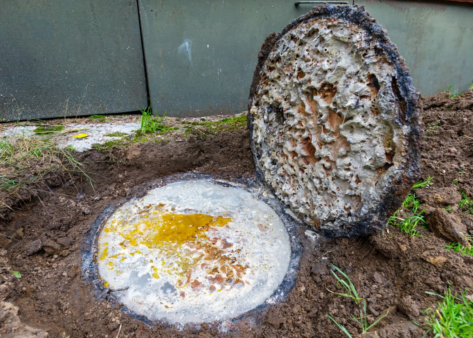 Overflowing private sewer with dangerous toxic wastes and a foul smell in a residential yard.