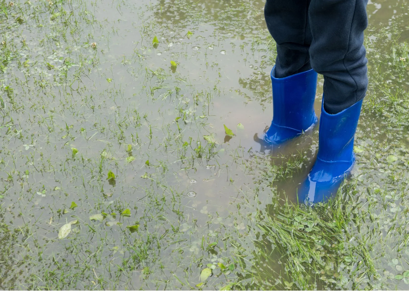 A flooded yard with a person wearing jeans and blue rain boots with the boots covered with water up to the ankles.