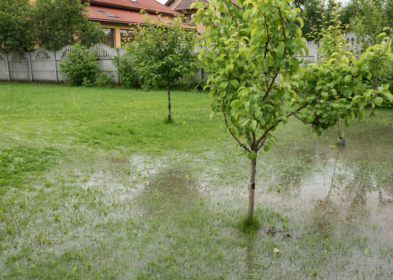 Water pooling in a yard with young trees and lots of grass and a white privacy fence in the background.